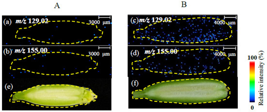 Distribution of forchlorfenuron in oriental melon, as shown by iMScope, in (A) control group (2 d after chasmogamy) and (B) treatment group (2 d after application of forchlorfenuron). (a–d) Product ion mass imaging MS of m/z 129.02, 155.00. (e,f) Optical image of oriental melon slides.