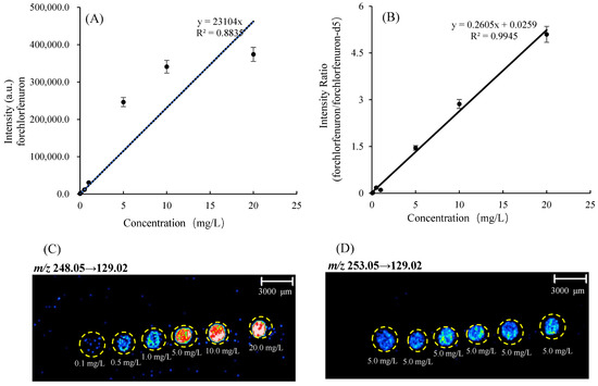MALDI-MSI experiment for quantitative analysis of forchlorfenuron from oriental melon tissue. Calibration curve (n = 3) of forchlorfenuron generated using (A) the average intensity of m/z 129.02 and (B) the ratio average intensity of m/z 248.05→129.02/253.05→129.02. (C) Ion intensity of m/z 248.05→129.02 of forchlorfenuron was used to generate MS/MS images. Calibration spots increase in concentration from 0.10 to 20.0 mg/L. (D) Ion intensity of m/z 253.05→129.02 of d5-forchlorfenuron (5.0 mg/L) was used to generate MS/MS images.