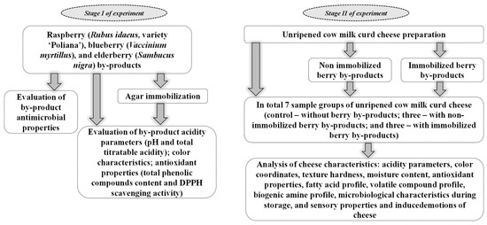 The general experimental design of this study is given in Figure 1. During the first stage of experiment (I), antimicrobial properties of the BIBs were tested, and the effect of the immobilization technology on BIBs acidity parameters (pH and total titratable acidity (TTA)), antioxidant properties (total phenolic compounds (TPC) content and 2,2-diphenyl-1-picrylhydrazyl (DPPH)-radical scavenging activity) and color characteristics was analyzed. During the second stage (II), non-immobilized (NI) and agar-immobilized (AI) BIBs were used for U-CC preparation, and their influence on U-CC sensory properties and induced emotions, acidity parameters, VC and FA profiles, BA concentration, color coordinates, moisture content and microbiological characteristics during the storage was evaluated.