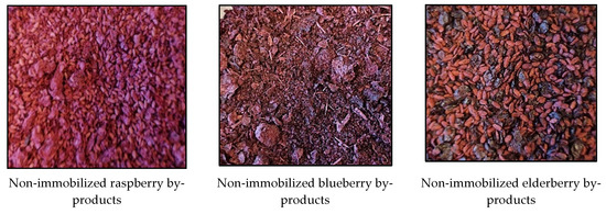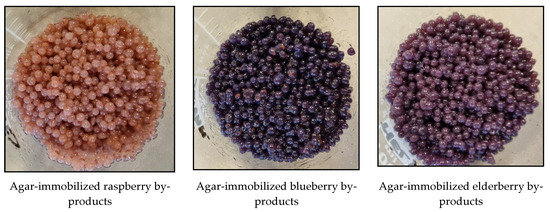 The agar powder was soaked in water (at 25 ± 2 °C for 1 h; 1 g agar powder in 20 mL of water) and further melted by heating for 5 min. Lyophilized raspberry, blueberry and elderberry BIBs were poured into the agar–water mixture (1 part of BIBs and 4 parts of agar–water mixture), and, with a syringe, drops of agar–water–BIB mixture were put into cold (+4 °C) refined sunflower oil. After obtaining a hard texture of the drop’s formation, they were removed from the oil, washed under a stream of warm water (+25 °C), dried at room temperature (+23 °C) for 12 h and, finally, used in further analyses and U-CC preparation. Images of the non-immobilized and immobilized BIBs are shown in Figure 2.