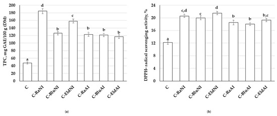 (a)—Mean values and standard errors of total content of phenolic compounds (TPC, mg GAE 100/g) and (b)—DPPH− radical scavenging activity (%) of unripened cow milk curd cheese samples (C—unripened cow milk curd cheese; Ra—raspberry by-products; Blu—blueberry by-products; Eld—elderberry by-products; NI—non-immobilized; AI—agar-immobilized; DM—dry matter; TPC—total phenolic compounds; GAE—gallic acid equivalents; DPPH—2,2-diphenyl-1-picrylhydrazyl free radical. Data are expressed as mean values (n = 3) ± SE; SE—standard error. a–d—Mean values within columns with different letters are significantly different (p ≤ 0.05)).