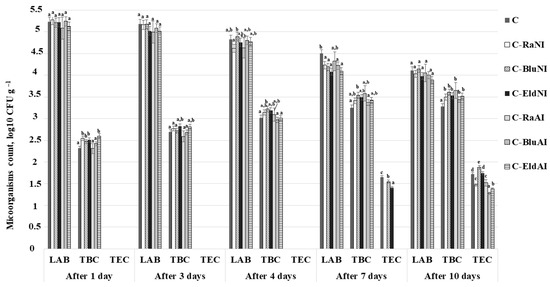 The U-CC samples were subject to microbiological analyses (total viable bacteria (TBC), total viable lactic acid bacteria (LAB) and total viable enterobacteria (TEC)). Microbiological analyses of the U-CC were performed after 1, 3, 4, 7 and 10 days of storage in a refrigerator at +4 °C.