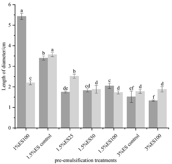 Appearance scores increased with increasing emulsifying salt content (1% ES100, 1.5% ES100 and 3% ES100). Furthermore, in the 1.5% ES group (1.5% ES control, 1.5% ES25, 1.5% ES50 and 1.5% ES100), the higher the degree of pre-emulsification, the higher the score. This result was consistent with expectations.