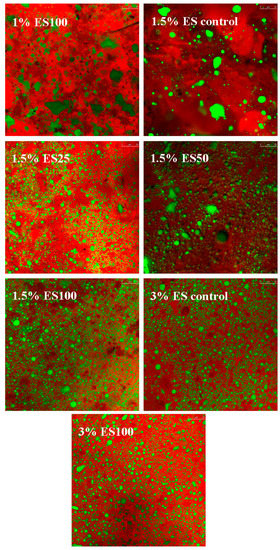 Figure 2 shows the CLAM scans of different samples. In the figure, the fat phase is labeled in green and the protein phase in red. The 1% ES100 group and the 1.5% ES control group had obvious free fat aggregation and uneven fat distribution. The micrograph from CLSM could give a more intuitive indication of cheese meltability and free oil release conditions. The fat distribution of 1% ES100 and 1.5% ES control cheese groups was uneven, and there was obvious fat accumulation. With the increased extent of pre-emulsified process, the fat particle size of 1.5% ES25 and 1.5% ES50 cheese groups decreased significantly compared with the 1.5% ES control group, but there was still a certain degree of fat aggregation. In the 1.5% ES100, 3% ES control and 3% ES100 cheese groups, milk fat was evenly dispersed in the continuous protein matrix. Compared with the 3% ES control and 3% ES100 cheese groups, the amount of emulsifying salt in the 1.5% ES100 cheese group decreased by 50%. It can be concluded that pre-emulsification of milk fat could improve the functional properties (meltability and free oil release conditions) (Figure 1) and microstructure of reduced-sodium processed cheese. The 1.5% ES100 group with pre-emulsified 100% fat had a more continuous protein network compared to the 1.5% ES control cheese group.