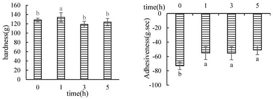 The results of the determination of the texture properties of the hairtail surimi gel by Monascus fermentation at different times are shown in Figure 1. The fermentation time had significant effects on the texture of surimi gel (p < 0.05). The hardness, gumminess, and chewiness of surimi increased after fermentation for 1 h and then gradually decreased. Springiness did not change within 3 h of fermentation but significantly decreased after 3 h. The cohesiveness value gradually decreased, while the adhesiveness value significantly increased with the increase in fermentation time. Therefore, the 1 h fermentation group improved the texture properties of the hairtail surimi gel.