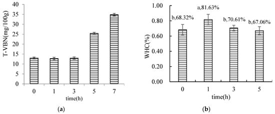 The T-VBN of surimi at various Monascus fermentation periods is depicted in Figure 4a. During the 0–3 h of fermentation with Monascus, there was no discernible change in the T-VBN of hairtail surimi. The amount of hairtail surimi progressively rose during 3–5 h of fermentation, reaching a maximum of 25.4 mg/100 g at 5 h. Therefore, fermentation can inhibit the growth of spoilage microorganisms in surimi and reduce the formation of amines. This result is similar to the experimental results of ZHANG Da-wei et al. [41]. However, with the increase in time, the strains in this experiment became complex microorganisms. When the fermentation period approached 7 h, its T-VBN was 34.8 mg/100 g, which does not satisfy the criteria of the national standard (GB 10136–2015 T-VBN/(mg/100 g) ≤ 30). As a result, the time of the subsequent experiments of MFHS was limited to 5 h.