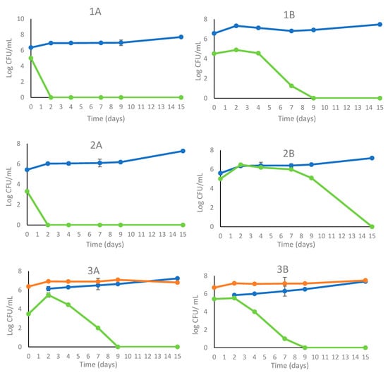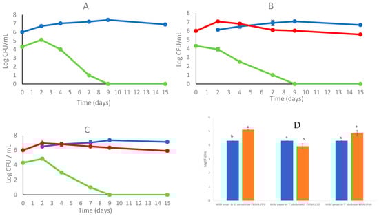 Growth kinetics and biocontrol action of S. cerevisiae DiSVA 709 in pure culture (A) in sequential fermentation with T. delbrueckii strain DiSVA 130 (B) and commercial strain T. delbrueckii ALPHA® (C) (without SO2 addition). S. cerevisiae DiSVA 709 (