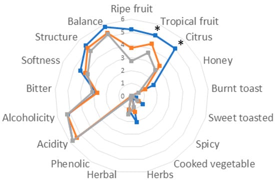 The wines obtained by the second fermentation trials (without SO2 added) were evaluated by sensory analysis to establish the role and the influence of T. delbrueckii in their aroma features and complexity. The results, reported in Figure 3, show a general appreciation by the tasters, with each wine distinguished by distinctive aromatic notes and without defects. The wines obtained by T. delbrueckii/S. cerevisiae DiSVA709 fermentation were perceived to be more balanced with relevant fruitiness (ripe fruit, tropical fruit, and citrus). The wines produced by T. delbrueckii/S. cerevisiae ALPHA® and S. cerevisiae DiSVA 709 fermentations were perceived with the same trend but with a lower score. These results fit well with the determination of some volatile compounds as acetate esters.