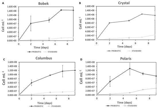 Yeast cell counting during fermentation with standard and probiotic yeasts with the four hops tested ((A): Bobek, (B): Crystal, (C): Columbus, and (D): Polaris).