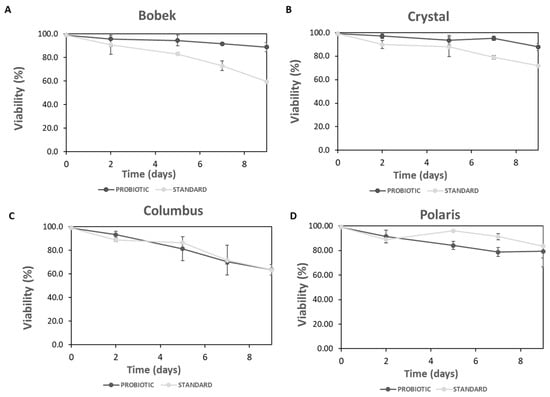 Yeast cell viability during fermentation with standard and probiotic yeasts with the four hops tested ((A): Bobek, (B): Crystal, (C): Columbus, and (D): Polaris).
