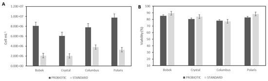 Cell counting (A) and viability (B) of probiotic and standard yeasts after 30 days of secondary fermentation and maturation using the four hop varieties (Bobek, Crystal, Columbus, and Polaris).