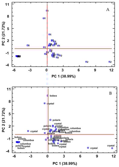 Distribution of all samples on the plane defined by the PCs as a function of the yeast used (A) and the variety of hop (B). 0: initial samples before inoculation; 1: beers produced with standard yeast; 2: beers produced with probiotic yeast.