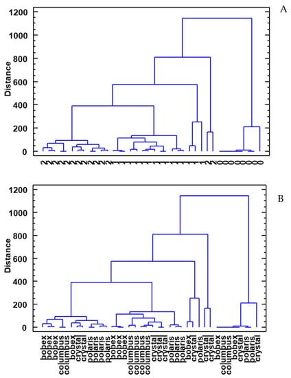 Finally, a cluster analysis of the data obtained from the samples was carried out to graphically demonstrate the differences and similarities with respect to the volatile profiles of the beers (Figure 5). Three clusters can be differentiated in (A): beers made by standard yeast, probiotic beers, and initial samples before inoculation. These results again reflect the influence of the type of yeast on the volatile profile of beers. On the contrary, clear groups were not observed as regards the type of hops used (B).