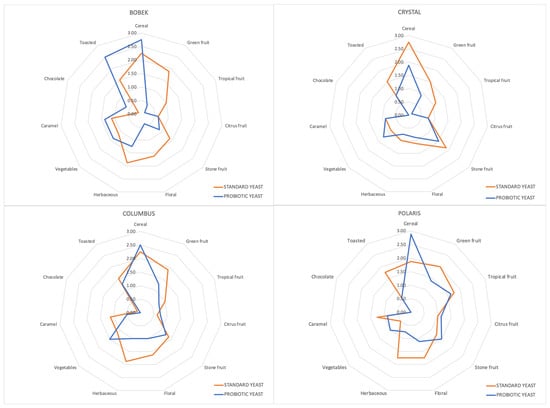In this study, eleven descriptors were evaluated for beers brewed with control and probiotic yeast for all hop varieties in order to describe their aroma. In Figure 6, the punctuation of all of them in the descriptive tasting is represented when comparing both types of beer with each hop variety. As expected, with the same fermentation conditions and the same raw materials except for the hop variety, the aromatic profile changed. Furthermore, as can be seen, the yeast employed in the fermentation stage modified the organoleptic profiles of the different beers. This is in consonance with the differences observed in the volatile composition of the different strains. These modifications were different according to the employed hop variety. In general, more fruity and floral characters were described in the beers elaborated with standard yeast. They also obtained better punctuation in the herbaceous character. On the other side, higher punctuation was obtained in the cereal descriptor for the beers elaborated with the probiotic strain in three of the four hop varieties.