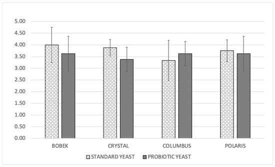 Plato’s degree was measured after the second fermentation. A lower dry extract content in the standard yeast was observed, with the exception of Columbus hops. These results indicate a higher consumption of sugars in the standard strain compared with the probiotic one. However, significant differences were only observed between both strains when using Crystal hops.