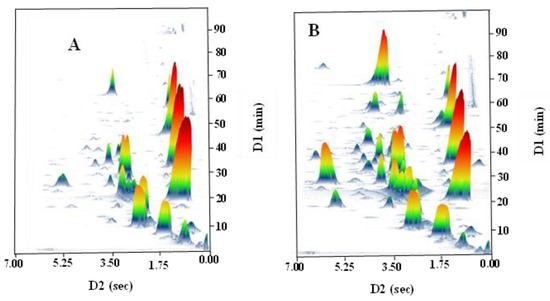 The three-dimensional (3D) spectra obtained from GC×GC–TOFMS analysis are shown in Figure 1. In both treatments, most of the signals appeared in 1D-RT of 2.0–60.0 min and 2D-RT of 0.0–7.0 s. The number and relative content of volatile components in organic strawberry samples (without IMI, Figure 1A) were lower than in IMI-treated strawberry samples (Figure 1B) between 20.0 and 60.0 min of 1D-RT, and between 2.0 and 7.0 s of 2D-RT. Similar phenomena were also reported in a previous study [19], possibly due to photochemical reactions between IMI and the volatile compounds of strawberries, resulting in the release of the radical NO2 under irradiation. These results indicate that IMI treatment affected the volatile compounds of strawberries.