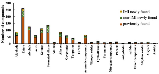 Figure 3A shows a slightly higher total number of VOCs identified in IMI-treated strawberries (825) in comparison with the non-IMI group (779), including 440 compounds that were found in both. The number of VOCs observed in each treated group was higher (553) than in strawberries previously observed by Cannon et al. [10]. Furthermore, the combination of the most abundant five categories of aldehydes, esters, alcohols, acids, and ketones, exceeded 50% in both non-IMI and IMI-treated strawberries (Figure 3B). This result was consistent with Zhao et al. [24], where they accounted for 60% of the total. The number of aldehyde compounds under IMI treatment (68) was approximately the same as in non-IMI-treated (61) strawberries. Significantly, esters were the most numerous compounds, with higher numbers under IMI treatment (198) than in the non-IMI group (163), consistent with results reported previously in the literature [10,26]. Interestingly, IMI treatment also increased the number of alcohol and ketone compounds. This result might be due to the increased number of aldehydes, which are precursors of alcohols and ketones in strawberries, via LOX and hydroperoxide lyase (HPL) [27,28]. Similar synthetic pathways were also reported under IMI treatment in tea plants [29]. These results suggest that IMI treatment may influence the LOX-HPL pathway in strawberries. In addition, the application of IMI increased the number of acids from 37 to 51. Sharma et al. [30] and Zhou et al. [31] proposed that the accumulation of organic acids could defend against stress caused by IMI and other neonicotinoid insecticides. These results indicated that IMI triggered the stress response and interfered with the VOC composition of the strawberries.