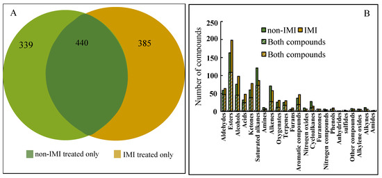 Comparison of the composition of compounds in 23 catalogs with those in IMI-treated and non-IMI-treated strawberries, obtained by GC×GC-TOF-MS. (A) Compounds in different treatments; (B) compounds in 23 catalogs.