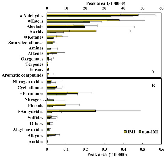 Comparison of the peak areas of compounds in 23 catalogs, for IMI-treated and non-IMI-treated strawberries, obtained by GC×GC-TOFMS. (A) peak areas > 0.5 × 105; (B) peak areas < 0.5 × 105. * represents a significant difference.