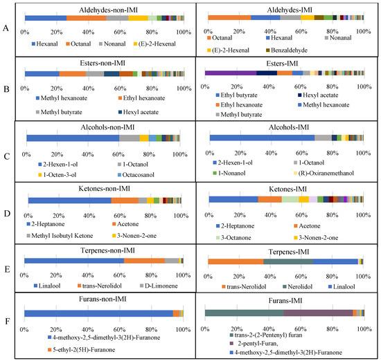 Relative contents of the volatile organic compounds in strawberries from non-IMI treatment and IMI treatment groups. (A) Aldehydes; (B) esters; (C) alcohols; (D) ketones; (E) terpenes; (F) furans.