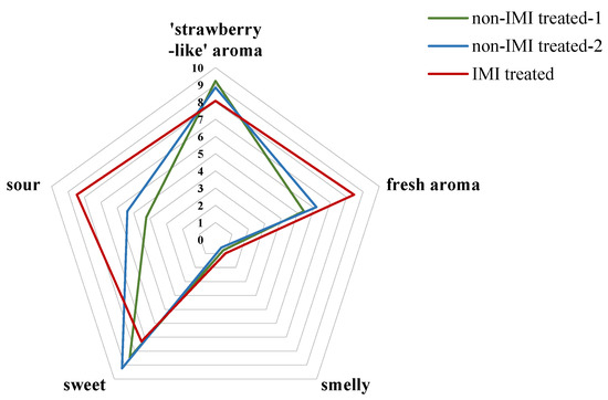 Twenty-six assessors (16 females, 10 males) were assigned to sensory evaluation. The assessors were asked to evaluate the mature strawberries from two control groups and one IMI-treated group. The calyxes of fresh strawberries were removed and rinsed in water. In the sensory evaluation, the assessors rinsed their mouths with mineral water between samples, and no additional information was given to the assessors [21]. Samples were coded with three random digits. No information on sample order was provided. Based on a previously described scoring method, ‘strawberry-like aroma intensity’, ‘fresh aroma intensity’, ‘sweetness intensity’, ‘sourness intensity’, and ‘smelly intensity’ were evaluated [22].