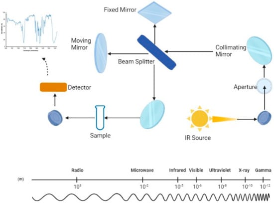 Mid-infrared spectroscopy (MIRS) is one of the most relevant technologies in the dairy industry for predicting the chemical and technological properties of different food matrices, and one of the most promising fields of application is milk [13,14,15,16,17]. In the mid-infrared region (2500 to 25,000 nm), electromagnetic radiation passes through matter, causing movements (e.g., vibration and rotation) of molecules through molecular bonds, resulting in varying degrees of energy absorption. By analyzing the energy supplied and the quantity absorbed by the sample, it is possible to determine the chemical composition of the examined sample [13]. Figure 1 summarizes the MIRS optical system and the wavelength scale through a schematic diagram.