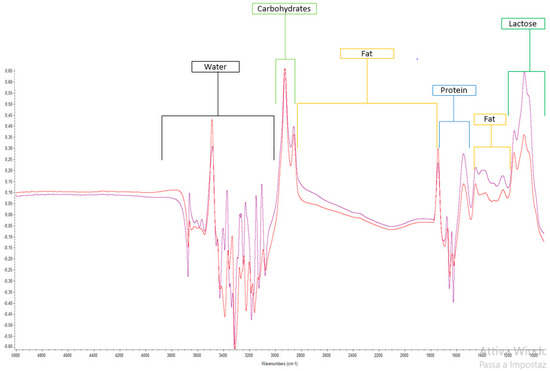 Scampicchio and Colleagues (2016) [66] explored the potentiality of a routine chemical analysis tool (Milkoscan®) combined with a chemometric model (PLS-DA) to identify and discriminate the geographical origin of milk samples coming from Alpine (North and South Tyrol area) and milk samples coming from other European regions. In this study, the cow milk samples were discriminated according to their geographical origin with an error lower than 5%, taking into account fatty acids content, dry matter, and freezing point as the most important contributors to the variance. Table 1 summarizes the applications of mid-infrared (MIR) spectroscopy to the analysis of milk mixture samples. Generally speaking, the main bands obtained in the spectra, reported in the literature, were connected to the presence of functional groups belonging to water, lipids, and proteins in the range between 4000 and 1500 cm−1 [24]. The major peaks in the spectra range of 1500–1700 cm−1 are proteins. In protein spectra, the amide bands originate from the vibration of peptide groups, and in particular, absorption in this area has been assigned to amide I and amide II [67]. An absorption peak at approximately 1400 cm−1 and 1700 cm−1 is attributed to lipids and fats. The band in the 2800–3000 region represents carbohydrates, while the 900–1200 cm−1 region is associated with lactose. For fatty acids, the selected regions for most fatty acid categories are included approximately in the spectral subsets 950–900 cm−1, 1000–1250 cm−1, 1700–1800 cm−1, and 2800–2900 cm−1 [65]. Finally, peaks between 3400 and 3000 cm−1 and between 1700 and 1500 cm−1 correspond to the O-H stretching and O-H folding regions, respectively, thus indicating the presence of water in these regions of the spectrum [30]. Figure 2 summarizes these putative regions.