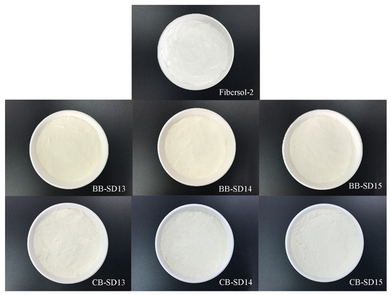 The concentrated broth (BBC and CBC) was visually darker than the original broth (BB and CB), and the BBC was visually darker than the CBC (Figure S1). In order to produce an instant drink powder with more health benefits, FS-2 was utilized as a carrier. Figure 1 shows the color of spray-dried instant powders prepared from mixtures of BBC or CBC with FS-2. The BB instant powder was yellower than the CB powder. The moisture contents of the BB and CB instant powders (4.41–7.06%, 1.72–3.55%) were, in descending order, SD13 > SD14 > SD15 (Table S1). As the level of FS-2 increased, the water activity (0.315–0.365, 0.226–0.307) also decreased significantly. This finding is related to changes in the moisture level in instant powder. It seems that FS-2 could retain less water and reduce the water activity, which means that the shelf-life can be extended. Among the three ratios of FS-2, 1:5 is recommended, because a higher ratio of microcapsule packaging helps to reduce the risk of core components interacting with the external environment.