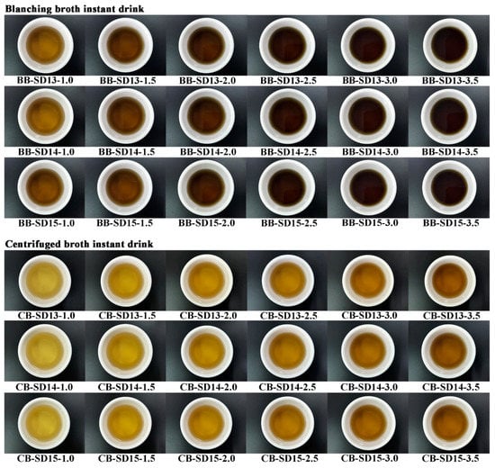All instant drinks were made by brewing instant powder with boiling water. Figure 2 shows the color of the instant drinks in which instant powders were brewed in boiling water. As the solid concentrations of BB or CB increased, the drinks became darker. For all instant drinks, as the solid concentration of BB or CB increased, the L* and h* values decreased significantly, while a*, b*, c*, and ΔE showed the reverse (Table S2). The h* values of all instant drinks were 80.77–98.50° (Table S2), which implies that they were between yellow (60°) and green (120°) [46], as is consistent with the color of the instant drinks shown in Figure 2.