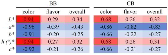A heatmap based on the correlation between color parameters and the hedonic sensory scores of the instant drinks has been constructed (Figure 3). The color scores of the hedonic sensory evaluation show high positive correlations between L* and h (°)* and negative ones between a*, b*, and c*. Interestingly, the BB drink showed stronger relations when compared to CB. This indicates that the dark color of BB impacts its color hedonic score more strongly than in the case of CB.