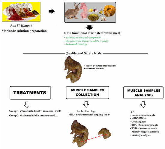 To our knowledge, information on the effects of marinade combined with Ras El-Hanout spice mix, ingredients, and seasonings typical of Algerian gastronomy, on the quality and safety of rabbit carcasses is scarce. Therefore, the purpose of the present work was to evaluate the effect of the addition of a marinade solution plus Ras-El-Hanout spice blend, on the sensory, quality, shelf life, and safety parameters of whole rabbit carcasses packed in low-O2 MAP during retail exposure at 7 ± 1 °C for 20 days. The opportunity to improve the organoleptic and microbiological quality of rabbit meat with bioactive compounds represents a sustainable strategy that could revive the rabbit meat sector and could certainly offer added value to the final product and differentiate it from the alternatives currently on the market.