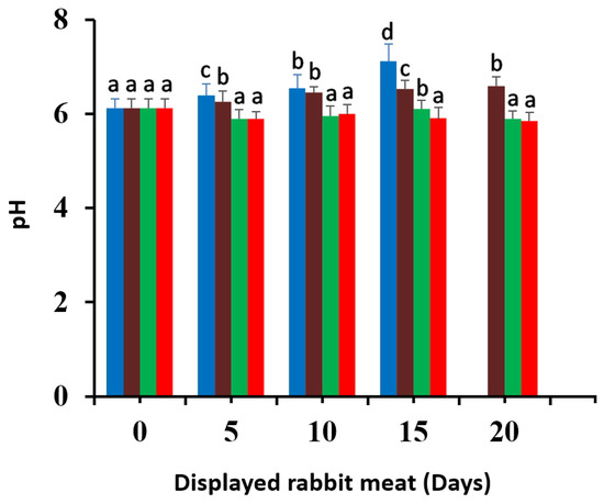 Commonly, an increase in pH value indicates the degradation of rabbit meat quality during storage, probably due to the production of basic substances (amines, ammonia) through the decomposition of proteins [21], and by the presence of large quantities of biogenic amines, which were produced by the fast development of microorganisms [22,23]. Similar findings were also reported in poultry meat by Yücel et al. [24] and Yusop et al. [25]. Wang et al. [26] observed that Sichuan pepper Zanthoxylum bungeanum essential oil exhibited a strong inhibition effect on the increase in pH during 12 days of rabbit meat storage due to antimicrobial properties.
