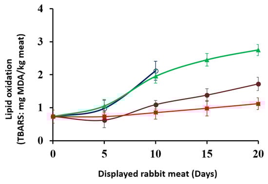 Rabbit meat is very rich in PUFAs, and therefore is considered very vulnerable to oxidative reactions [28,29]. Lipid oxidation constitutes one of the main causes of reduced shelf life of foods and has been implicated in the formation of rancid odor, discoloration, abnormal flavors [30], and worse, produces toxic compounds such as MDA, cholesterol oxidation products, and free radicals that can affect the health of consumers [31].