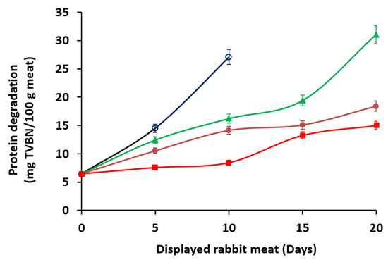 The increase in pH during storage has been often found to have a strong positive correlation with the amount of TVBN [64,68]. As previously indicated, the pH value of the marinated groups (2-A and 2-MA) did not change significantly (p < 0.05) during the retail display period despite the addition of concentrated lemon juice, probably due to post mortem muscle buffering capacity [69]. In addition to all that, rabbit antemortem practices that influence meat pH will play an important role in determining the final pH and the concentration of carbohydrates accessible for bacteria prior to being forced to metabolize protein molecules for energy. Thus, Sun et al. [70] found a positive correlation between pH and TVBN linked to a good environment for the proliferation of spoilage bacteria at higher pH values. High pH facilitates the gradual transition from carbohydrate (glucose, glycogen) dependent bacteria to protein-degrading bacteria. Umuhumuza and Sun [71] observed that a fast increase in the TVBN amount from 6 to 13.5 mg/100 g between the 2nd and 3rd day of storage at 4 °C was found upon the depletion of post mortem glucose in meat. Adding preservative compounds such as kojic acid, ε-poly-l-lysine, sodium diacetate, or potassium sorbate for stabilizing pH of pork meat stored under vacuum packaging allowed TVBN level below 12.5 mg/100 g after 21 to 42 days of storage [72].