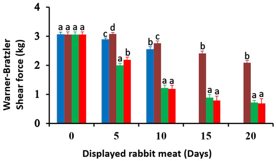 Instrumental tenderness was measured using the Warner–Bratzler (WB) method as described by Djenane et al. [3]. Therefore, to avoid excessive variability between samples, it is important to consider the direction in which the muscle is cut in relation to the orientation of the muscle fibers. At least six cores (1 cm diameters × 3 cm in length) from each rabbit leg portion were removed parallel to the longitudinal orientation of the muscle fibers. The cores were sheared perpendicular to the muscle fibers’ orientation using an Alliance RT/5 (MTS Systems Corp., Eden Prairie, MN, USA) with a WB shear device and crosshead speed set at 2 mm/s. Results were expressed as load in kg.