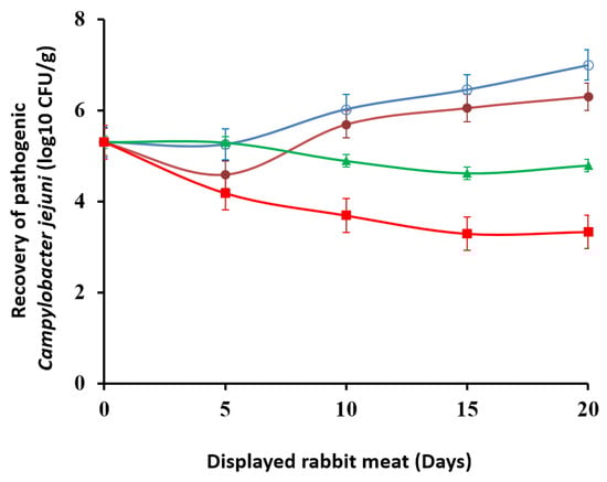 On each sampling day, 25 g of rabbit meat samples were aseptically weighed into a sterile plastic stomacher filter bag (Seward) and diluted with 225 mL of buffered peptone water (CM1049). The content was homogenized in the stomacher (Inter Science, Saint Nom, France) for 2 min at room temperature. The resulting slurries were serially diluted in sterile peptone water. Sample dilutions were spread and plated on appropriate media in duplicate. The media used for enumeration of C. jejuni was Campylobacter blood-free selective medium (CCDA) (CM0739 plus selective supplement SR0155). The CCDA plates were incubated at 42 °C for 48 h in 2.5-L gas jars with CampyGen microaerophilic generating gas packs (CN0025). Counts of aerobic psychrotrophic bacteria were determined in plate count agar (PCA) (CM0463) and incubated at 7 °C for 10 days. Brochothrix thermosphacta was enumerated on streptomycin sulfate cycloheximide thallous acetate agar (STAA) (CM0881), supplemented with STAA Selective Supplement (SR0151) following 18 h of aerobic incubation at 26 °C. Pseudomonas spp. were enumerated in plates of Pseudomonas CFC selective agar (CM0559 plus selective supplement SR0103) which were incubated at 25 °C for 48–72 h. The logs of mean values for the counts from triplicate plates were recorded. Counts were expressed as the log10 of colony-forming units (CFU) per gram (log10 CFU/g).