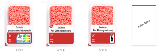 The following attributes were included in the study: eco-labels, production condition, protein source, origin, and price (Table 2). Minced meat was chosen as the product category because unlike whole meat cuts, there are reasonable product depths of both meat-based and plant-based products available at Austrian retailers. The product category is well-known and accessible for all population groups [43,65,92]. To rebuild products with realistic prices according to the market conditions, a store check was conducted on the 21st and 22nd of December 2022 in Vienna. Therefore, the three main retailers, representing around 90% of the Austrian retail market share, were visited [93,94]. Price attributes and protein sources based on the product range from the store check were defined as between 3.59 € and 5.99 € per 400 g and included the protein sources beef, hybrid, and plant-based with pea protein [43,87]. Up until now, hybrid meat has been offered in Austria online only (beef and pea protein 50/50). This has gradually made meat reduction more accessible to consumers [65], and it is thus part of this study. Two eco-labels were included in the experimental design, the binary label “Carbon Trust” with the claim “CO2 Reduced” referring to the company’s measurement and reduction of the product’s carbon footprint [33,95,96]. For the study we used a self-designed Climate Protection label and referred to it as the “Carbon Trust label”. Second, as a comprehensive multi-level label, an adapted design of the French Planet Score label was used [97] which, in this study, is referred to as the “Planet Score”. The Eco-Score includes multi-traffic light (MTL) scores ranging from A–E: an overall score and ratings for the three subcategories climate, water protection, and biodiversity [1]. Also, these issues are more tangible to consumers compared to more complex topics such as eutrophication [98,99]. The Planet Score is either shown with a relatively good (B) or a relatively bad (D) overall rating, comparable to the study of Sonntag et al. [9]. To fulfill the DCE requirement of independent attributes [100], Planet Score grades were not linked to the actual product’s environmental impact, which is a slight deviation from the objective grading of food products. Beef, for instance, should not be graded with Score B, as GHG emissions are, in general, quite large for beef production [98]. Previous studies found that the environmental impacts of both animal and plant-based ingredients can vary widely and that there is a range where impacts can overlap [48]. Thus, it may be realistic that under certain production conditions (intensively farmed beef emits around three to four times less CO2 equivalents compared to an extensive production system [101]), beef might be graded as mediocre or relatively good. The ratings of the subcategories have small deviations in accordance with the overall rating found in the literature [99]. Further relevant product attributes for consumers are the production conditions, organic and conventional [36,65,95], and the origin of production, “Austria” and “within the EU” [31,37].