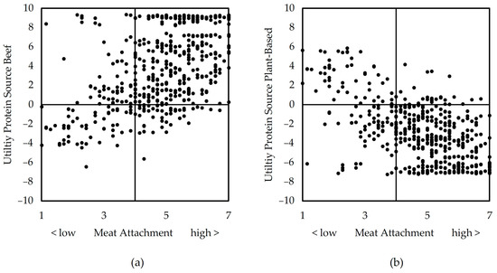 This further analysis clearly shows that preferences for animal-based protein sources are strongly influenced by MA. The personal emotional bond towards meat consumption drives preferences for beef and aversion to plant-based protein, leading to the acceptance of hypothesis 4: The more respondents are attachment to meat, the less they prefer meat alternatives (r = −0.58 ***) and the higher their preference for meat is (r = 0.51 ***). This relation was the strongest within all constructs. MA obviously has the largest impact on consumers’ decision to accept or reject meat alternatives. Figure 2 visualizes these relationships by a positive correlation between (a) MA and the utility of beef and a negative one between (b) MA and the utility of plant-based alternatives. There are some exceptions from these overall tendencies, in particular, on the upper left side in (a) and the lower left side in (b), but in general, the assumption holds.