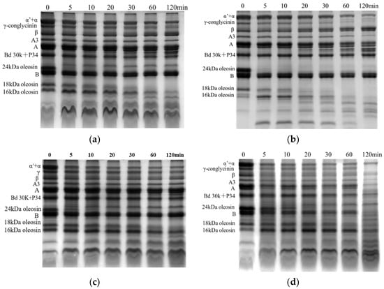Tricine–SDS–PAGE protein profiles of pH 7.0-SOB (a,b) and 11.0-SOB (c,d) treated using different heat treatments. (a,c) represents heated SOBs; (b,d) represents the floats obtained by centrifuging heated SOB emulsions.