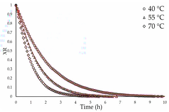 Using experimental data fitted by Page’s model (red line) to the drying curves of dragon fruit peels at various temperatures: 40 °C (○), 55 °C (△), and 70 °C (◊). XR: moisture ratio vs. time (hours).
