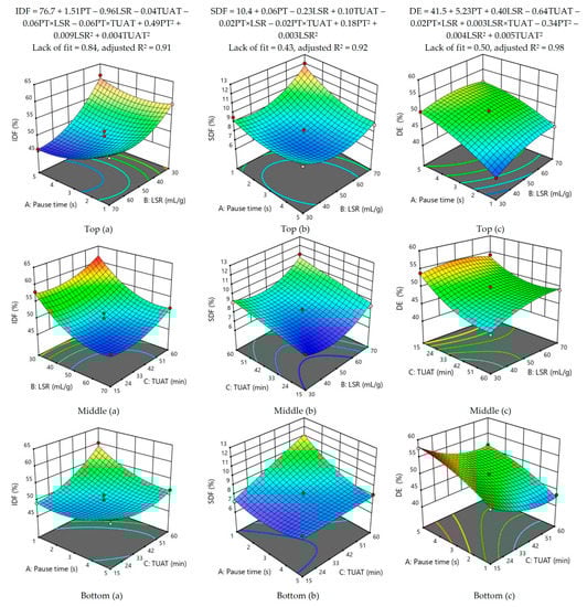 The significance of the mathematical models for IDF, SDF, and DE was evaluated by calculating p-values, and only those with a significant level (p < 0.05) were considered. Non-significant terms were then eliminated from the model, resulting in the development of a reduced quadratic model. This new model showed a substantial increase in statistical significance, reaching a highly significant level (p < 0.001) as indicated in Table S4. Specifically, the terms LSR×TUAT, LSR×TUAT, TUAT2, and PT×TUAT were removed for IDF, SDF, and DE, respectively. The lack of fit demonstrated non-significance (p > 0.05), indicating a good fit of each model to the data. The lowest adjusted R2 value was observed in the response surface model for IDF (0.90). However, after performing the reduction of non-significant terms, the adjusted R2 value increased to 0.91, and the value of the sum of squares of the predicted residuals (PRESS) was reduced (Table S4). According to Encina–Zelada et al. [35], a higher PRESS value indicates lower predictive quality, so it is recommended to eliminate non-significant terms to reduce PRESS and increase R2. The adjusted R2 values for all response surface models were above 0.90 (Figure 2), indicating the suitability of these models. Additionally, the equations of the predictive models are shown in Figure 2, being all adjusted R2 values greater than 0.90 and the values of the lack of fit test were non-significant (p > 0.05), indicating good fit to experimental data [49].