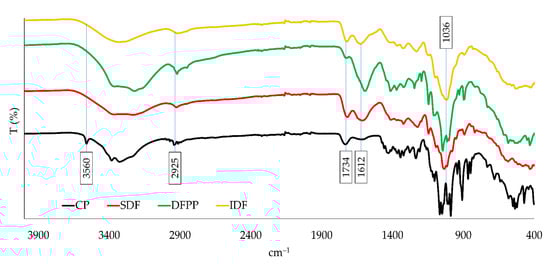 Five distinct peaks were found in the FTIR examination at the following wavelengths: 1036, 1612, 1734, 2925, and 3560 cm−1 (Figure 3). Carbohydrates are distinguished by the peculiar peak form seen at 1036 cm−1. According to Spinei and Oroian [32], the major chemical groups of the various polysaccharides may be distinguished between 1410 and 800 cm−1. Oliveira et al. [60] and Chua et al. [1], reported that non-esterified carboxylic groups are seen at wavelengths close to 1610 cm−1, a finding that is comparable to the peak seen in our study (1612 cm−1). The above-mentioned authors also noted that the peak at 1734 cm−1, which corresponds to the same wavelength as in Figure 3, is due to the stretching vibration of the methyl-esterified carboxylic groups. In comparison to CP, SDF, and IDF, DFPP showed the lowest peak at 1734 cm−1. Since DFPP is a raw sample, this disparity may be attributed to the lack of extracted dietary fiber (IDF or SDF). The peak at 3415 cm−1 corresponds to hydroxyl groups (−OH), whereas the peak at 2936 cm−1 belongs to various methyl groups (−CH, −CH2, −CH3) [60]. As the SDF had more non-esterified carboxylic groups (1612 cm−1), as opposed to methyl-esterified carboxylic groups (1734 cm−1), the DE should have been lower [61]. The acid–base titration technique, which indicates a DE of 39.7%, may classify SDF as low methyl-esterified pectin (<50% DE) as reported by Reichembach and Oliveira [62] (Table 5), who supported this assumption.
