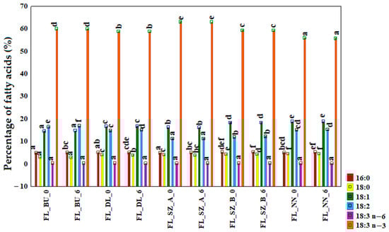 Fatty acids composition expressed as a percentage of total fatty acids (%) for fresh (0 month) and stored (6th month) flaxseed oils. a–f—different superscript letters above bars indicate significant differences analyzed for each fatty acid (p ≤ 0.05). FL_BU_0 and FL_BU_6 (Bukoz variety at 0 month and after 6 months, analogously), FL_DL (Dolguniec variety), FL_SZA, FL_SZB (Szafir variety), and FL NN (Unknown variety).