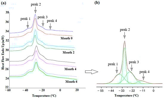 (a) Melting curves obtained from DSC analysis of cold-pressed flaxseed oil (FL_SZB) with heating rate of 5 °C/min during whole shelf life (0, 2, 4, and 6 months); (b) and deconvolution of melting curve of fresh flaxseed oil.