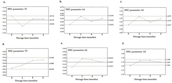 As it was shown in Table 2, Table 3 and Table 4, various parameters of the melting curve for flaxseed oils, i.e., peak temperature (T1, T2, T3, and T4), peak height (h1, h2, h3, and h4), peak area (A1, A2, A3, and A4), and the percentage of the peak area (P A1, P A2, P A3, and P A4) were analyzed within six months of storage. It was shown that for the first and third peaks, all DSC parameters (T, h, A, P A) did not change significantly within the storage time (p > 0.05). From a total amount of 16 variables (4 DSC parameters × 4 peaks) analyzed, the parameters that were remaining and anchored within the control limit in the X-bar chart were selected and denoted as ‘stable parameters’. Figure 3 shows that the control charts for these parameters were found to be stable during storage, which are pertinent for all oil samples. No point exceeded the control lines on either the X-bar charts or on the R charts between “0 month” and “6 months” of storage. This means that the average level of the parameter, as well as its variability, was stable throughout the storage period. The control limits on the X-bar charts can therefore be considered as a range that is characteristic and not changeable during storage for a particular melting profile parameter of the flaxseed oil. In Figure 3a–c, stable parameters associated with the first peak are presented (i.e., T1, h1, and A1), while Figure 3d–f illustrates the parameters for the third peak (i.e., T3, h3, and A3). Based on the data acquired from the melting curves, these multivariate X-bar charts show that the first and third peak areas, heights, and temperatures did not cross the limits between the upper control limit line (ULC) and the lower control limit line (LLC), except for the T1, h3, and A3 parameters, where one control point appeared outside the range.