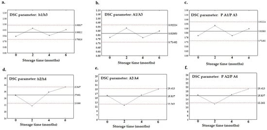 X-bar control charts of DSC parameters recognized as stable within six months of storage; for the ratio calculated for the first and third peaks: (a) h1/h3, (b) A1/A3, and (c) P A1/P A3, and for the second and fourth peaks: (d) h2/h4, (e) A2/A4P, and (f) P A2/P A4.
