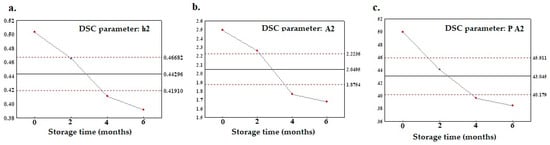 The second purpose of this study was to recognize the DSC melting profile parameters that changed within the storage time. However, only the parameters with increasing or decreasing trends indicating changes caused by storage were considered. In order to establish these, the control charts were analyzed in terms of the parameters for which the two control lines for the fresh and stored oils were exceeded via crossing the ULC and LLC from both ends. Figure 5a–c illustrates the control charts with the parameters of the main peak height and area (h2, A2, and PA2) for which the values decrease throughout the shelf life of the oil. From Table 3 and Table 4, it is clearly seen that for all the flaxseed oil varieties, the values h2, A2, and P A2 are significantly lower after six months of storage, which coincides with the control charts presented in Figure 5a–c.
