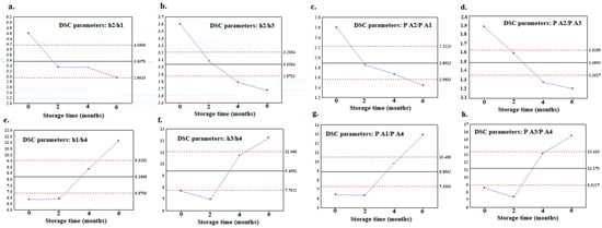 The trend within the storage time of the ratio calculated for the parameters of the peak height (h2/h1, h2/h3, h1/h4, and h3/h4), as well as the ratio of the peak area (A2/A1, A2/A3, A1/A4, and A3/A4) was also analyzed using the control charts (Figure 6a–h). can be seen, a downward trend was observed for ratios h2/h1 and h2/h3 (Figure 6a,b), as well as for A2/A1 and A2/A3 (Figure 6c,d). In turn for the parameters of h1/h4, h3/h4, A1/A4, and A3/A4, an increasing trend was shown (Figure 6e–h). Analogously, as for the ratios of the peak area (A2/A1, A2/A3, A1/A4, and A3/A4), the same trend was observed for the ratio of the percentage of the area (PA2/PA1, PA2/PA3, PA1/PA4, and PA3/PA4), which means that the values increased or decreased by the same pattern (Figure S1; Supplementary Data).