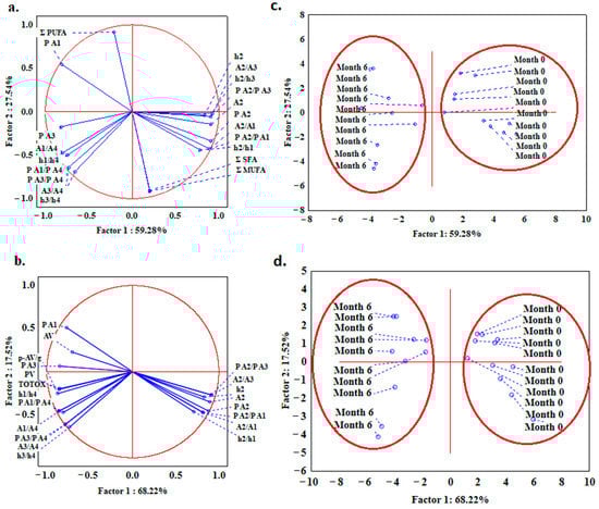 PCA analysis with projection of the variables: (a) DSC unstable parameters and fatty acids content; (b) DSC unstable parameters and chemical indicators (PV, p-AV, AV, and TOTOX); PCA analysis with projection of the cases showing distribution and separation of flaxseed oil samples based on their stability control by means of (c) DSC parameters and fatty acids content; and (d) DSC parameters and chemical indicators.
