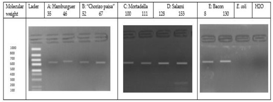Figure 1. Amplified DNA fragments of the iap gene in suspected L. monocytogenes isolates obtained from the different meat products. Representative wells are depicted. (A) Isolate 35, 46, obtained from roasted hamburger meat; (B) Isolate 52, 67, from “chorizo paisa”; (C) Isolate 100, 111, obtained from mortadella; (D) Isolate 128, 153, obtained from salami; (E) Isolate 8, 130, obtained from bacon. In all the isolates, a PCR product of approximately 660 bp was found (MP. Ladder marker; E. coli. Escherichia coli—negative control; H2O negative control).